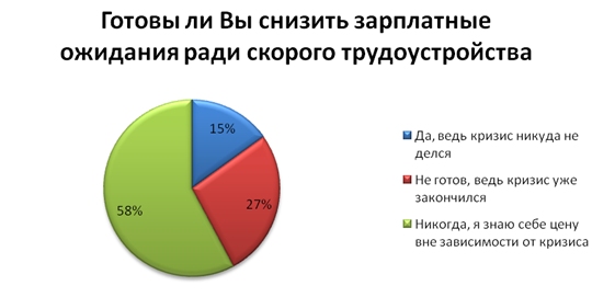 Исследование показало, что кризис и его реалии не способны заставить российских специалистов и управленцев снизить свои зарплатные ожидания ради скорого трудоустройства. О такой принципиальной позиции заявили 58% опрошенных. Еще 27% респондентов добавили, что также не готовы понизить свою цену перед потенциальным работодателем в связи с тем, что кризис, по их мнению, уже завершился. И только 15% готовы пойти на уступки и согласиться на более низкую зарплату, так как кризис и связанный с ним алгоритм поведения для них все еще актуален.