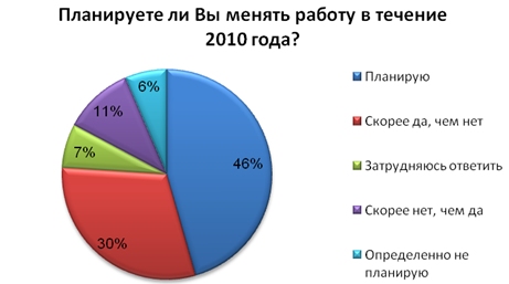 46% респондентов ответили утвердительно на вопрос о возможной смене работы в 2010 году, тогда как 30% скорее склоняются к подобному варианту, нежели приняли твердое решение. Остаться на нынешнем рабочем месте планируют только 6% респондентов, в то время как 11% еще не определились в своем выборе.
